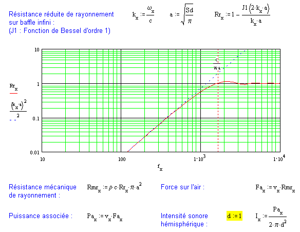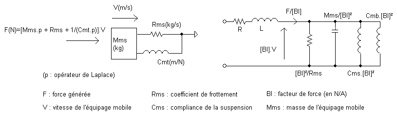 Le fichier Mathcad en copies d'images ci-après est à disposition par mail. Il permet à partir des sept paramètres fondamentaux du haut-parleur sujet, d'obtenir la courbe du rayonnement sonore dans l'hémisphère qui lui fait face. La membrane est idéalisée à un piston plan et rigide de surface "Sd", monté en charge close. Les calculs sont déduits de ce schéma équivalent par analogie électrique / mécanique :