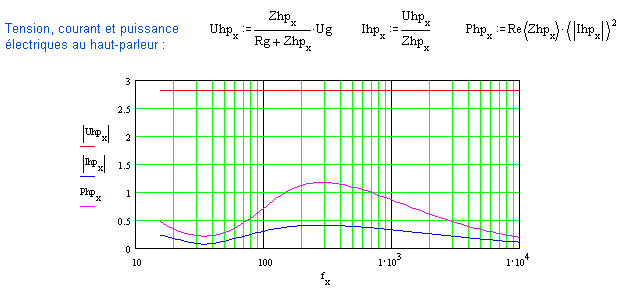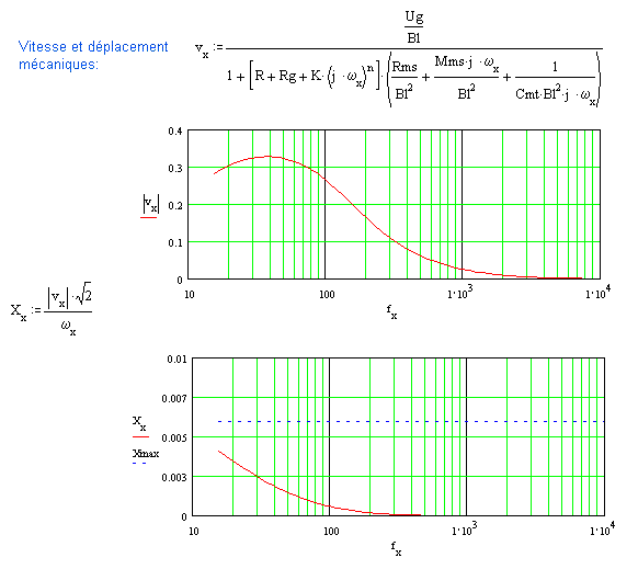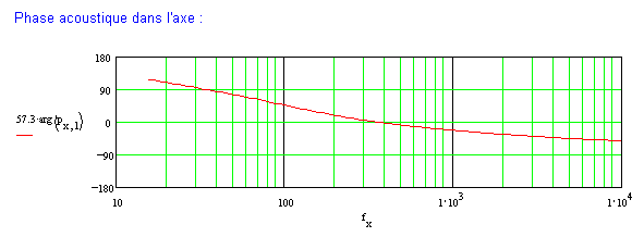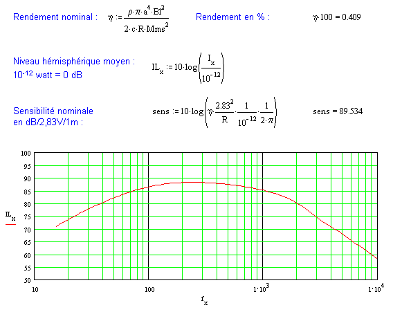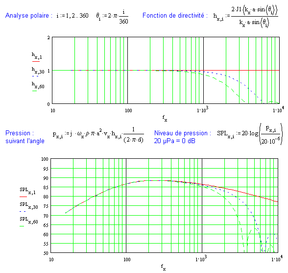 Ci-dessous une mise en formules qui permet un calcul de la réponse dans l'axe. Seul l'effet inductif considéré à la bobine mobile freine les aigus à partir du piston "parfait" (une self de 0mH donne une réponse axiale sans pente dans le haut du spectre). A 30° puis à 60°, on vérifie bien la chute en énergie.