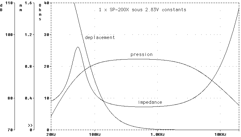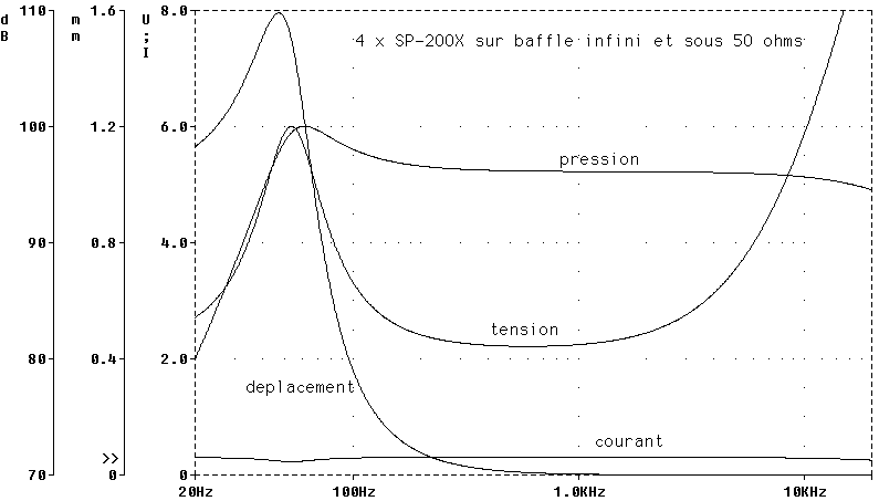 Cette cote souvent faible sur les haut-parleurs large bande doit être le garde-fou à tenir en respect. Le SP-200X de Monacor, bicône suffisamment économique pour nos essais est à 1.6mm, valeur respectable face à la concurrence plus prestigieuse mais insuffisante pour suivre le principe de l'amortissement optimisé du grave par l'impédance du générateur, ce à un niveau réaliste. Employer alors quatre transducteurs multipliera la surface émissive et pourra contrecarrer le "Xmax" trop limitatif.