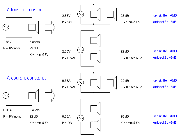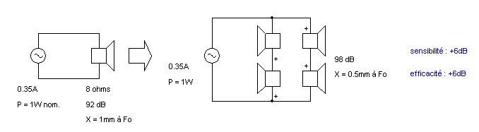 e rendement d'un réseau de haut-parleurs répond à une loi acoustique qui va nous intéresser lors du montage sur baffle fini. Pour des longueurs d'onde grandes face à l'assemblage des HPs, ici jusqu'à environ 200Hz, deux sources alimentées par le même signal sont dites corrélées et le rendement de la conversion énergétique double (http://www.linkwitzlab.com), donc +3dB d'efficacité en dB/W (et non de sensibilité en dB/2,83V) pour un montage série comme pour un montage parallèle.