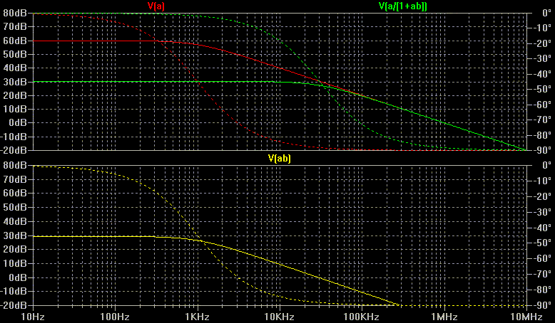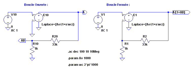 Tout système connaît une limitation en vitesse traduite pour A par l'expression complexe Ao/(1+jf/fc), avec Ao le gain statique et fc la fréquence de coupure à -3dB. Dans cette simulation LTspice, j·2·π·f s'écrit s et 2·π·fc est remplacé par ωc. Le lieu de Bode est le graphe du gain et de la phase. Il faut un unique pôle au gain de boucle A·B tant que celui-ci n'est pas passé par 0dB (x1), sous peine d'instabilité une fois la boucle fermée.