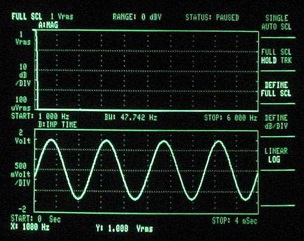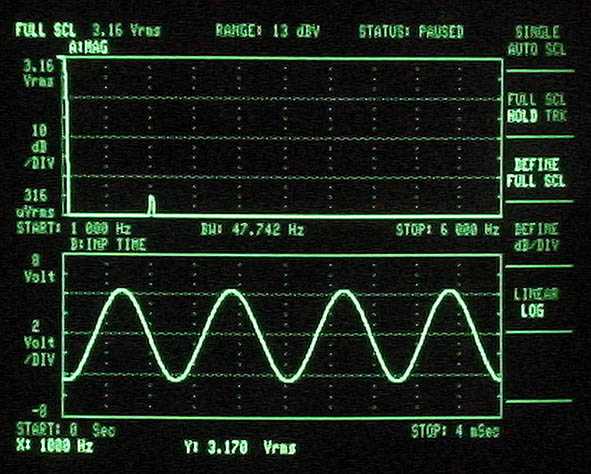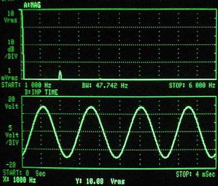 La non linéarité de la loi I=f(u) ou transconductance des semi-conducteurs fait que le traitement d'un signal dit fondamental donne naissance à des signaux déformants dits harmoniques. L'écran ci-après (3561 Hewlett Packard) analyse la sortie d'un Zenquito évolution 40W classe AB à 12,5W (10²/8) sur charge résistive, source sinus à 1kHz pur.