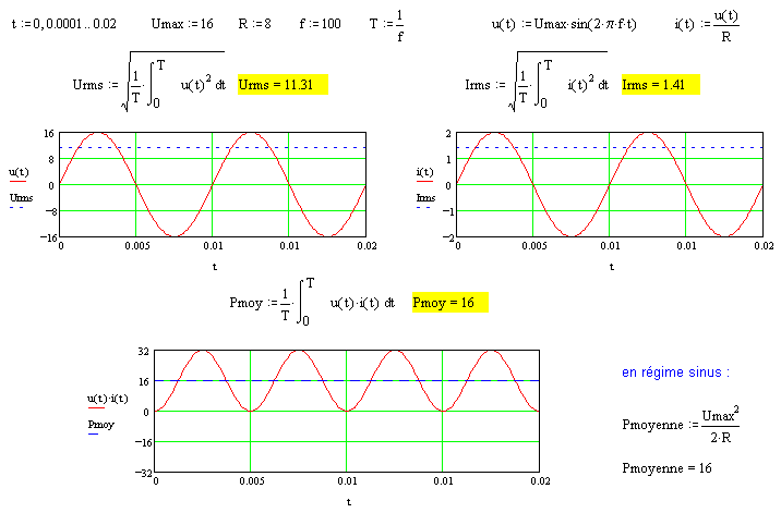 - Représentation temporelle en bas avec une tension crête à 14,1V (10Vx1,41) : (écran à 125mW) ; (écran à 1,25W) ; (écran à 25W)